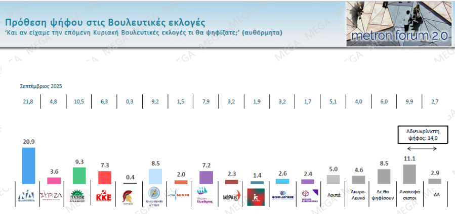 Ακολουθούν το ΚΚΕ με 7,3% (από 6,3%), η Πλεύση Ελευθερίας με 7,2% (από 7,9%) και ο ΣΥΡΙΖΑ με 3,6% (από 4,8%), ενώ η αδιευκρίνιστη ψήφος διαμορφώνεται στο 14%.
