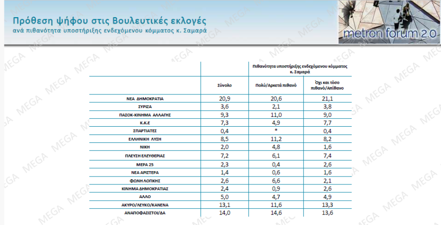 Με βάση τις απαντήσεις στην πρόθεση ψήφου, πιθανό να στηρίξουν ένα κόμμα Σαμαρά δηλώνουν μεταξύ άλλων: το 20,6% από τη ΝΔ, το 11% από το ΠΑΣΟΚ, το 11,2% από την Ελληνική Λύση, το 14,6% από τους αναποφάσιστους και το 11,6% από το άκυρο/ λευκό/ κανένα.