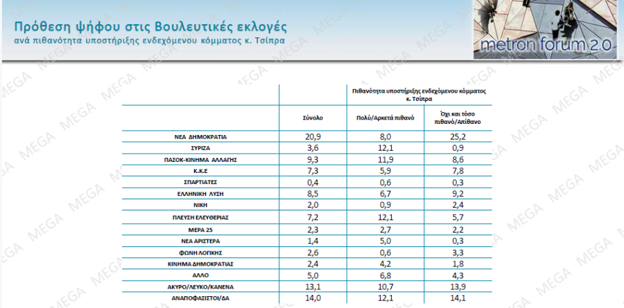 Με βάση τις απαντήσεις στην πρόθεση ψήφου, το 12,1% των αναποφάσιστων δηλώνουν ότι είναι πιθανό να ψήφιζαν ένα κόμμα Τσίπρα, ενώ 10,7% είναι το ποσοστό στο άκυρο/ λευκό/ κανένα. Το 6,8% από αυτούς που απάντησαν «άλλο» στην πρόθεση ψήφου λένε ότι είναι πιθανό να ψήφιζαν ένα κόμμα Τσίπρα, ενώ το ίδιο δηλώνει μεταξύ άλλων το 12,1% από τον ΣΥΡΙΖΑ, το 11,9% από το ΠΑΣΟΚ και το 12,1% από την Πλεύση.