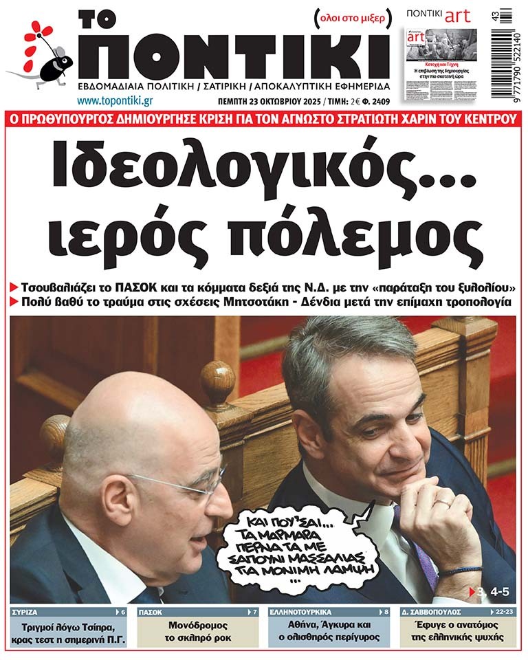 Με πρωτοσέλιδο τίτλο «Ιδεολογικός… ιερός πόλεμος» και αναλυτικό – αποκαλυπτικό ρεπορτάζ για τον πρωθυπουργό που δημιούργησε κρίση για τον Άγνωστο Στρατιώτη χάριν του κέντρου και τσουβαλιάζει το ΠΑΣΟΚ και τα κόμματα δεξιά της Ν.Δ. με την «παράταξη του ξυλολίου», αλλά και για το πολύ βαθύ τραύμα στις σχέσεις Μητσοτάκη – Δένδια μετά την επίμαχη τροπολογία , κυκλοφορεί το «ΠΟΝΤΙΚΙ» το πρωί της Πέμπτης.