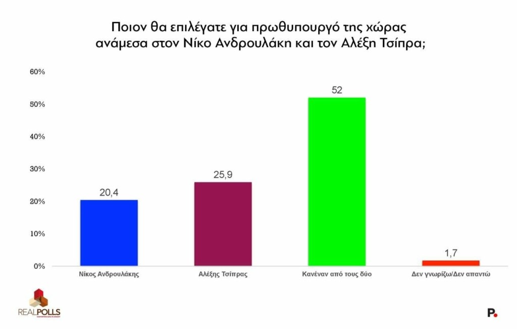 Σε ερώτηση για το ζευγάρι ανάμεσα στον κ. Τσίπρα και στον Νίκο Ανδρουλάκη, ο πρώην πρωθυπουργός προηγείται με 25,9% έναντι 20,4% .