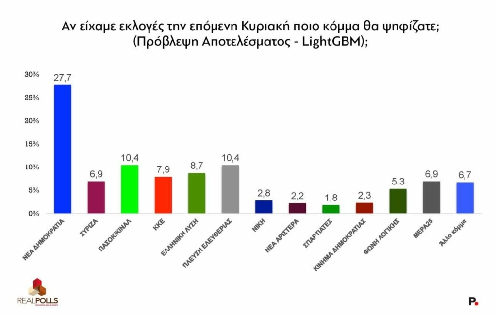 Στην εκτίμηση ψήφου η ΝΔ λαμβάνει 27,7%, ΠΑΣΟΚ και Πλεύση Ελευθερίας κονταροχτυπιούντια για τη δεύτερη θέση με 10,4% , τρίτο κόμμα η Ελληνική Λύση με 8,7% και τέταρτο το ΚΚΕ με 7,9%, ενώ ο ΣΥΡΙΖΑ λαμβάνει 6,9%.