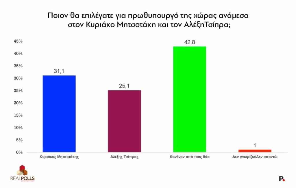 Συγκεκριμένα, στην ερώτηση «Ποιον θα επιλέγατε για πρωθυπουργό της χώρας ανάμεσα στον Κυριάκο Μητσοτάκη και τον Αλέξη Τσίπρα;», o Κυριάκος Μητσοτάκης προηγείται με 31,1% έναντι 25,1% του πρώην βουλευτή του ΣΥΡΙΖΑ. Κανέναν από τους δύο απαντά το 42,8%.