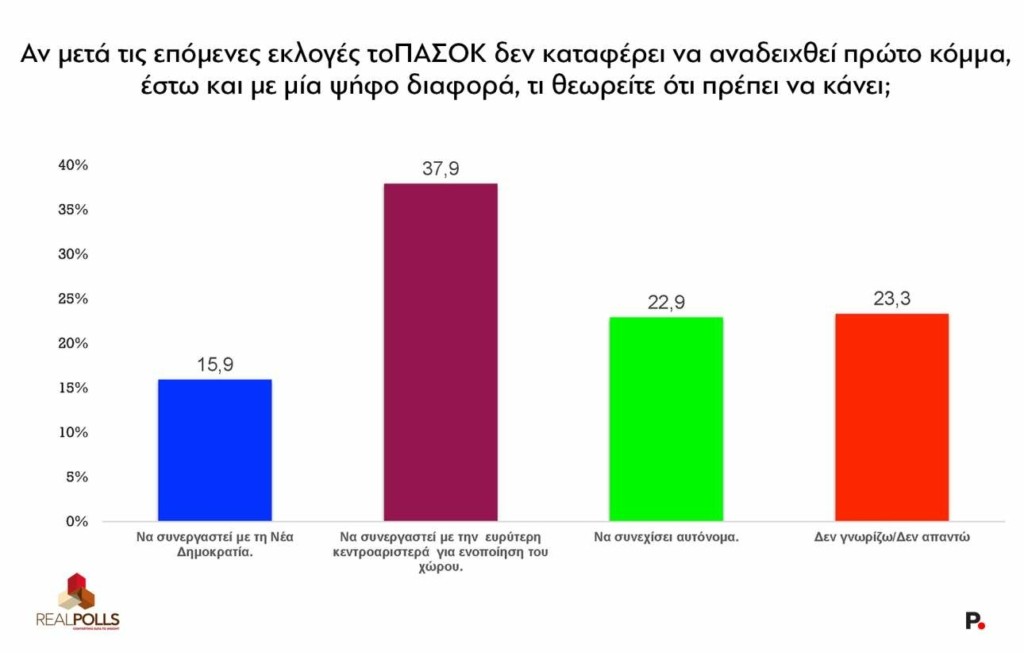 Αντίστοιχα ξεκάθαρη είναι και η άποψη των πολιτών για την επόμενη ημέρα του ΠΑΣΟΚ αν δεν αναδειχθεί πρώτο κόμμα στις εκλογές. Το 37,9% ζητά συνεργασία με την ευρύτερη κεντροαριστερά για ενοποίηση του χώρου.