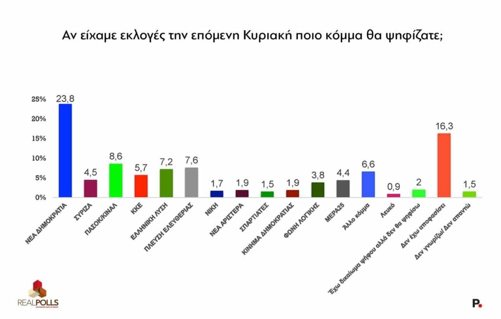 Στο ερώτημα για την πρόθεση ψήφου η Νέα Δημοκρατία βρίσκεται στο 27,7%, απώλειες κατέγραψε το ΠΑΣΟΚ-ΚΙΝΑΛ, που μετρήθηκε στο 8,6% ενώ στην τρίτη θέση, με 7,6%, αναρριχήθηκε η Πλεύση Ελευθερίας.