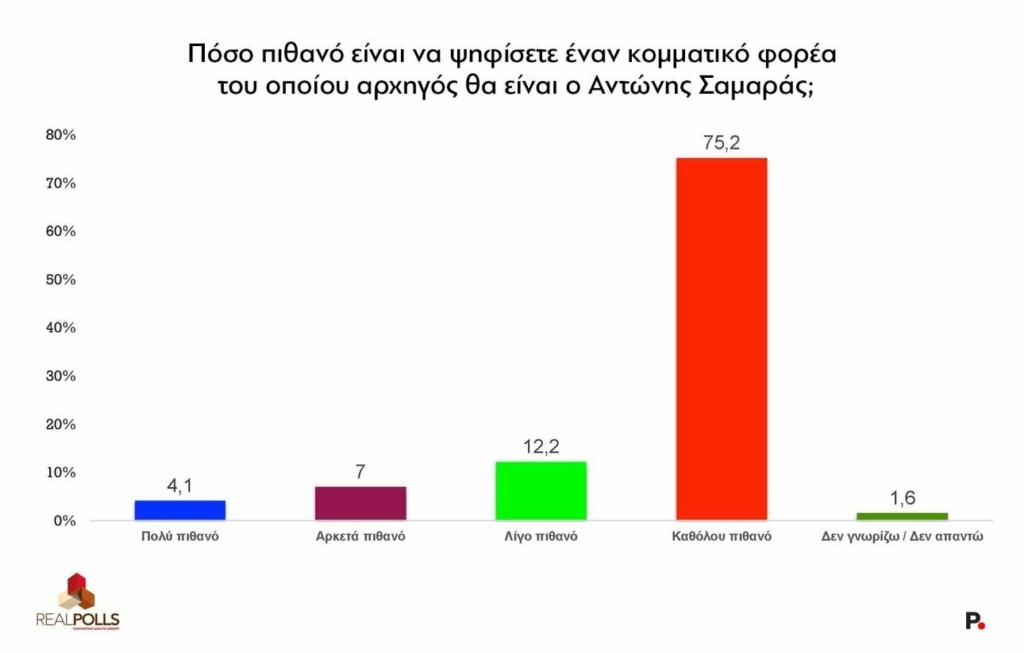 Για το πιθανολογούμενο κόμμα του Αντώνη Σαμαρά, στην ερώτηση πόσο πιθανό θα ήταν να ψηφίζατε έκα κόμμα του οποίου αρχηγός θα ήταν ο Αντώνης Σαμαράς, το πολύ πιθανό / αρκετά πιθανό αθροίζει 11,1%. Ο πρώην πρωθυπουργός και πρώην πρόεδρος της ΝΔ έχει «εξασφαλισμένο» μόνο ένα 4,1%, ενώ το 75,2% απορρίπτει ένα τέτοι ενδεχόμενο.