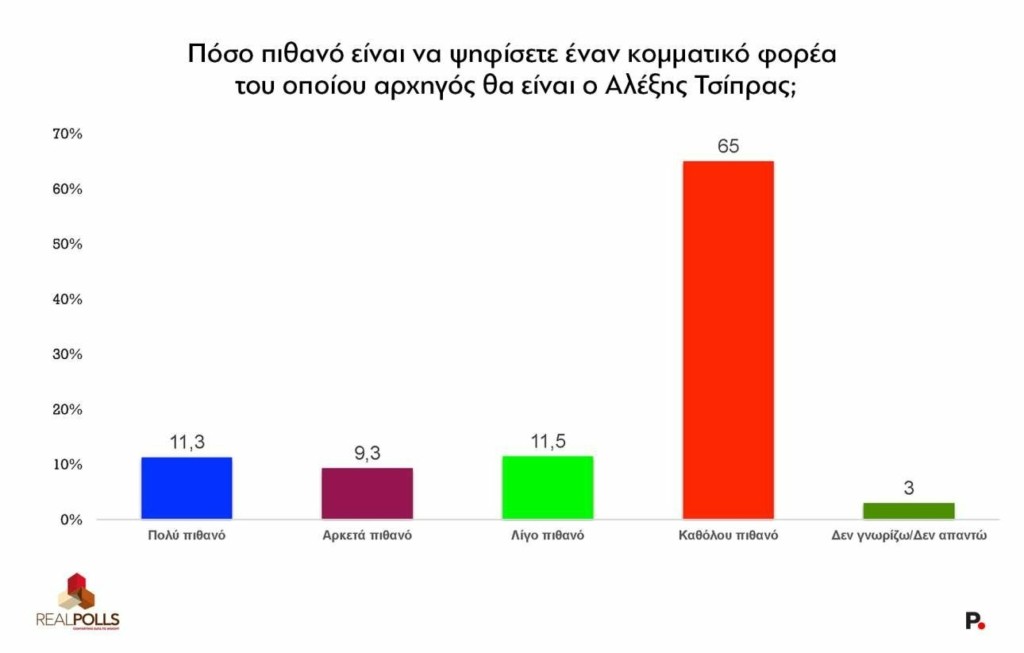Όσον αφορά στο φημολογούμενο κόμμα Τσίπρα, το 65% απαντά ότι δεν είναι καθόλου πιθανό να ψηφίσει έκα κόμμα του οποίου αρχηγός θα είναι ο πρώην πρωθυπουργός, με το 11,3% και 9,3% να απαντά πολύ και αρκετά πιθανό.
