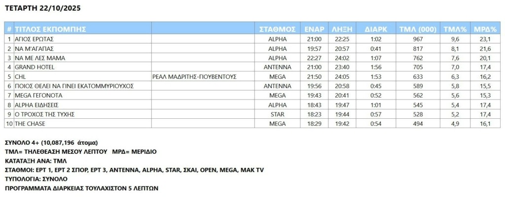 Για μια ακόμα φορά το Top 10 λες και ήταν μοιρασμένο στη μέση. Από τη μια οι σειρές του prime time, και από την άλλη κυρίως τηλεπαιχνίδια και δύο κεντρικά δελτία ειδήσεων.