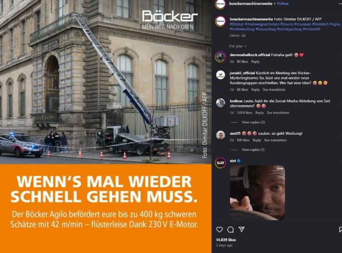 Πρωτοπορία και ευρηματικότητα… Μόνο έτσι μπορεί να χαρακτηριστεί η νέα διαφήμιση της εταιρίας γερανών Böcker Maschinenwerke που εκμεταλλεύτηκε στο έπακρο τη «διαφήμιση» που της έκαναν οι ληστές του μουσείου του Λούβρου.
