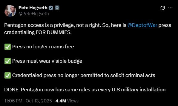 Το Πεντάγωνο, πάντως, εμφανίζεται δια της ηγεσίας του, αμετακίνητο από τη θέση του. Τον τόνο είχε δώσει στις 13 Οκτωβρίου ο Χέγκσεθ γράφοντας στο Χ ότι «η πρόσβαση στο Πεντάγωνο είναι προνόμιο, όχι δικαίωμα».