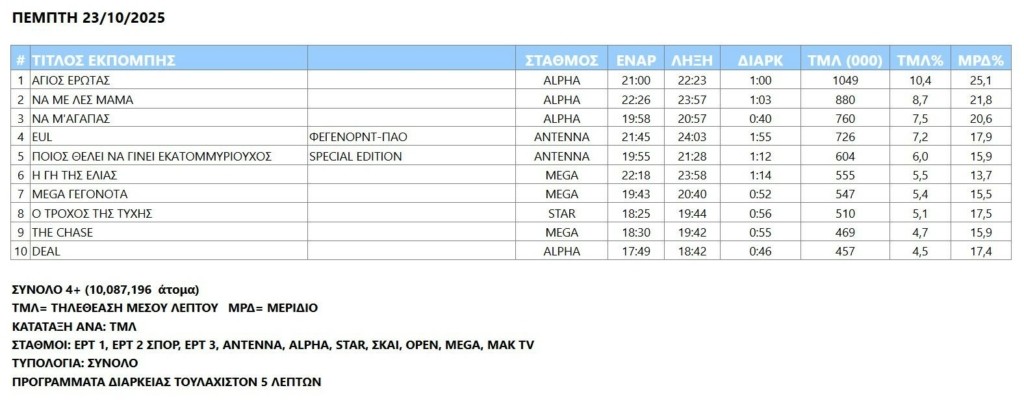 Διεύρυνε κι άλλο την «ψαλίδα» τηλεθέασης με τον ανταγωνισμό ο Alpha την Πέμπτη (23/10)