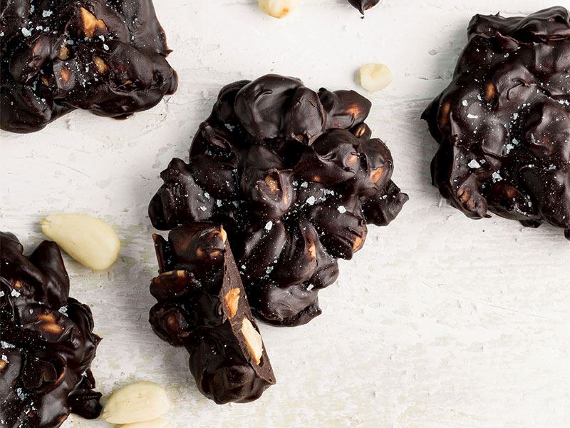 Μια γρήγορη και πανεύκολη συνταγή για απολαυστικά βραχάκια με τραγανά αμύγδαλα, βυθισμένα σε ένα παχύ στρώμα μαύρης σοκολάτας και πασπαλισμένα με θαλασσινό αλάτι.