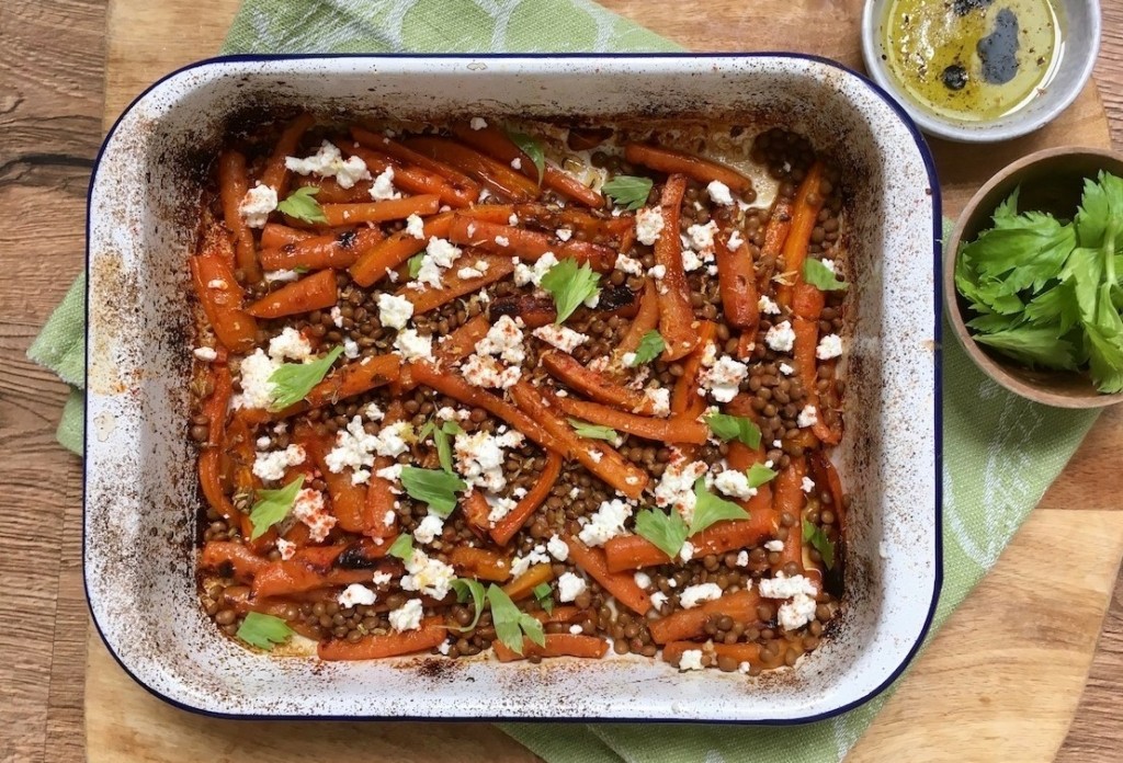 3. Τέλος, σε μια πιατέλα ή ρηχή σαλατιέρα ανακατέψτε τις φακές με τα φύλλα δυόσμου και λίγα φρέσκα φύλλα ρόκας ή μαρουλιού. Τοποθετήστε από πάνω τα ψημένα καρότα και πασπαλίστε με τη χοντροτριμμένη φέτα.