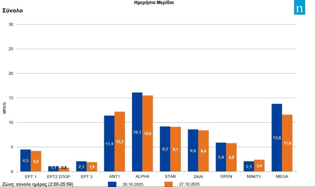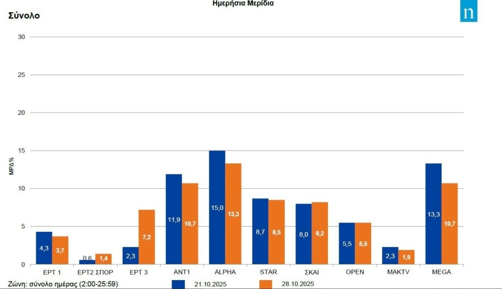 Έχει επίσης ενδιαφέρον ότι και τις δύο ημέρες δεύτερη επιλογή των τηλεθεατών ήταν ο ΑΝΤ1. Μάλιστα την Τετάρτη μοιράστηκε τη δεύτερη θέση με το Mega.