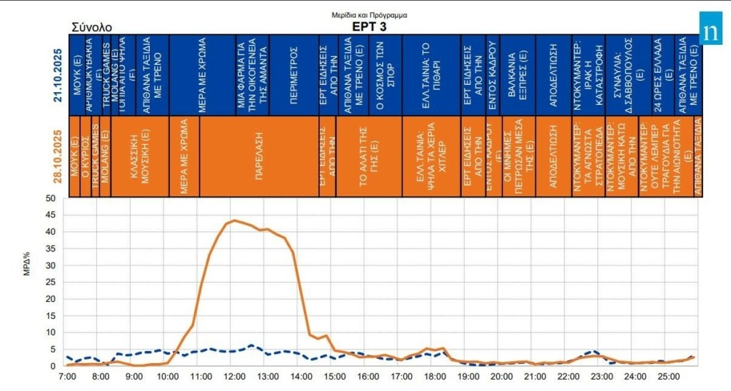 Συγκεκριμένα η ΕΡΤ υπογραμμίζει ότι: «Η στρατιωτική παρέλαση στη Θεσσαλονίκη σημείωσε μέσο μερίδιο τηλεθέασης 36,6%, το υψηλότερο από το 2023. Σε επίπεδο λεπτού, η τηλεθέαση έφτασε έως και το 45%, κατατάσσοντας την ΕΡΤ3 στην πρώτη θέση μεταξύ όλων των τηλεοπτικών καναλιών, κατά τη διάρκεια της παρέλασης.