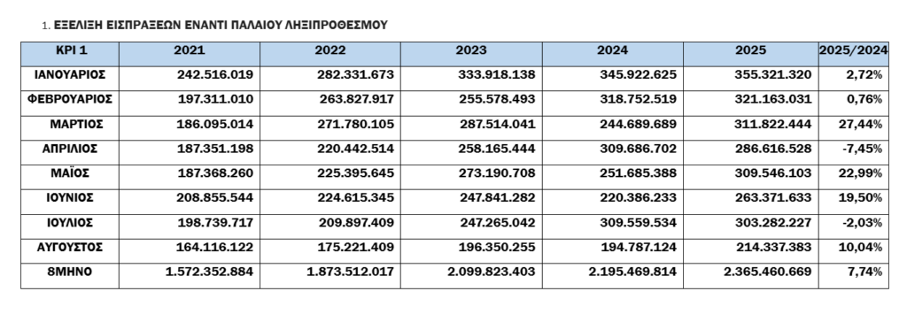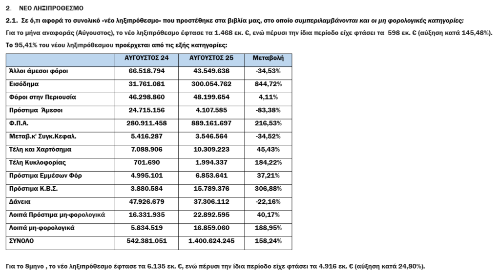 Για το οκτάμηνο, οι εισπράξεις έναντι νέου ληξιπρόθεσμου χρέους (εκτός 10 ΜΦΚ) ανήλθαν σε 1,861 εκατ. ευρώ, έναντι 1,663 εκατ. ευρώ την αντίστοιχη περίοδο του 2024, σημειώνοντας αύξηση 11,91%. Παρά τη βελτίωση των επιδόσεων είσπραξης, το συνολικό πρόβλημα των ανεξόφλητων φόρων διευρύνεται, υποδηλώνοντας ότι η βελτίωση των εσόδων οφείλεται περισσότερο σε διοικητική αυστηρότητα παρά σε πραγματική οικονομική ανάκαμψη.