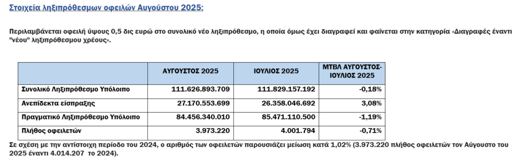 Παράλληλα, ο αριθμός των οφειλετών διαμορφώθηκε σε 3.973.220 φυσικά και νομικά πρόσωπα, αποτυπώνοντας το εύρος του προβλήματος και την αδυναμία μεγάλου μέρους της κοινωνίας να ανταποκριθεί στις φορολογικές της υποχρεώσεις.