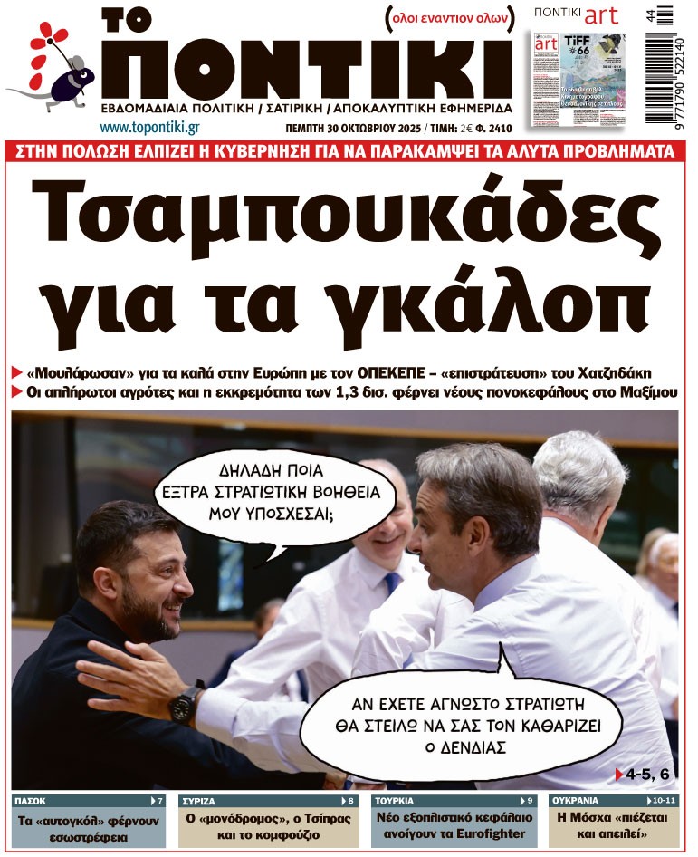 Με πρωτοσέλιδο τίτλο «Τσαμπουκάδες για τα γκάλοπ» και αναλυτικό – αποκαλυπτικό ρεπορτάζ για την πόλωση στην οποία ελπίζει η κυβέρνηση, καθώς «μουλάρωσαν» για τα καλά στην Ευρώπη για τον ΟΠΕΚΕΠΕ – επιστρατεύουν τον Χατζηδάκη, αλλά και για τους απλήρωτους αγρότες και την εκκρεμότητα των 1,3 δισ. που φέρνει νέους πονοκεφάλους στο Μαξίμου, κυκλοφορεί το «ΠΟΝΤΙΚΙ» το πρωί της Πέμπτης.