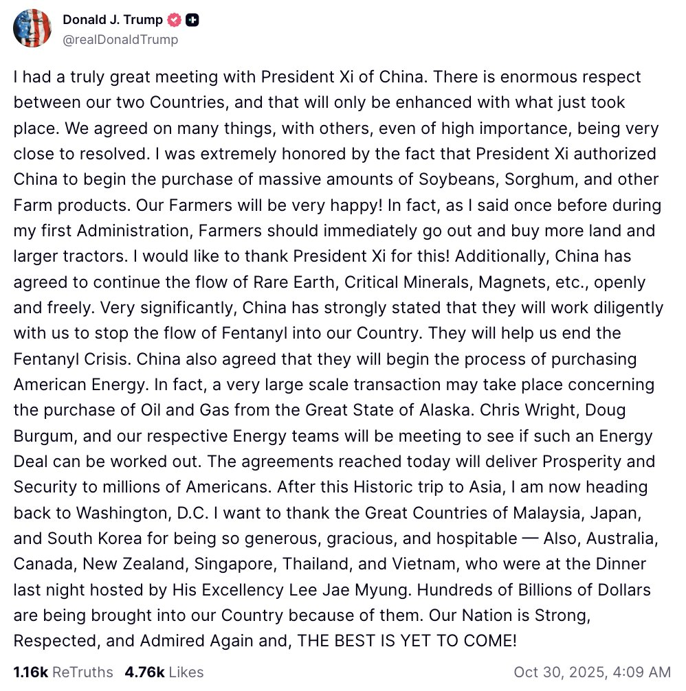 Η κυβέρνηση έχει σημειώσει πραγματική πρόοδο και στα τέσσερα: Η Κίνα έχει επισημάνει ισχυρές ενέργειες που έχει λάβει για την αποτροπή της εξαγωγής των βασικών χημικών ουσιών που χρησιμοποιούνται για την παρασκευή φαιντανύλης. Δεκάδες εταιρείες έχουν υποσχεθεί επενδύσεις πολλών δισεκατομμυρίων δολαρίων στην αμερικανική μεταποίηση. Το εμπορικό χάσμα ΗΠΑ-Κίνας έφτασε στο χαμηλότερο σημείο των τελευταίων 21 ετών τον Αύγουστο. Και ο Τραμπ και ο Σι συμφώνησαν στο πλαίσιο μιας συμφωνίας για το TikTok.