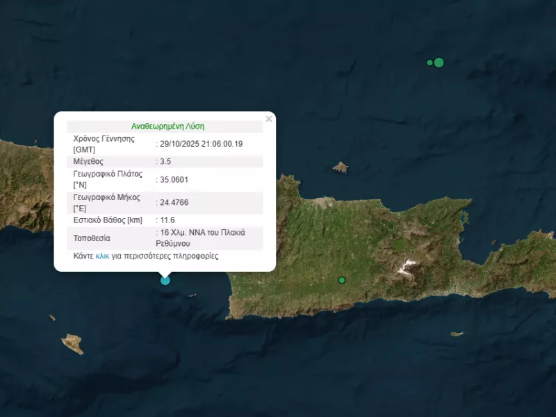 Σεισμική δόνηση μεγέθους 3,5 βαθμών της κλίμακας Ρίχτερ σημειώθηκε στις 23:06 το βράδυ της Τετάρτης στη θαλάσσια περιοχή ανοιχτά του Ρεθύμνου.