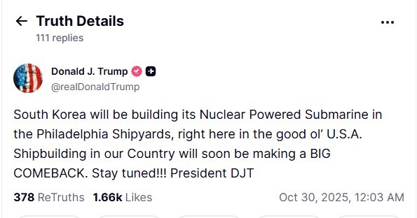 Ο Τραμπ σημείωσε ότι η στρατιωτική συμμαχία των δύο χωρών «είναι ισχυρότερη από ποτέ» και πρόσθεσε ότι, βάσει αυτής της ενίσχυσης, έδωσε έγκριση στη Νότια Κορέα να κατασκευάσει πυρηνοκίνητο υποβρύχιο, «αντί για τα παλαιού τύπου και πολύ λιγότερο ευέλικτα υποβρύχια ντίζελ που διαθέτει σήμερα».