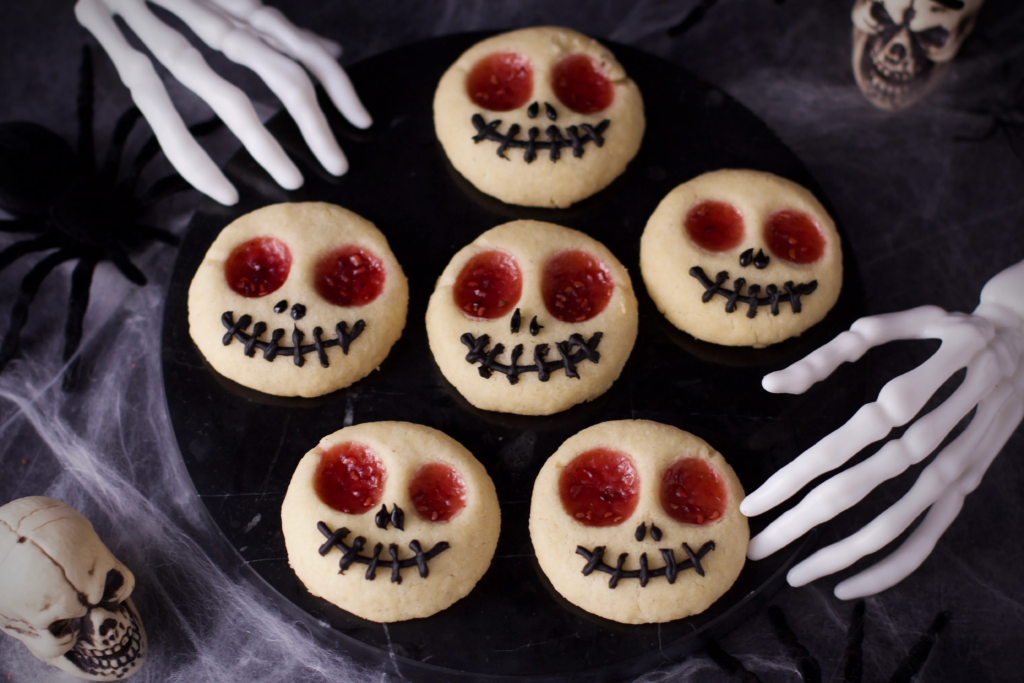 Τρομακτικά απλά και νόστιμα, τα μπισκοτάκια αυτά για το Ηalloween παίρνουν το σχήμα κρανίων και οι εσοχές τους (μάτια και στόμα) γεμίζουν με την αγαπημένη σας κόκκινη μαρμελάδα φρούτων.
