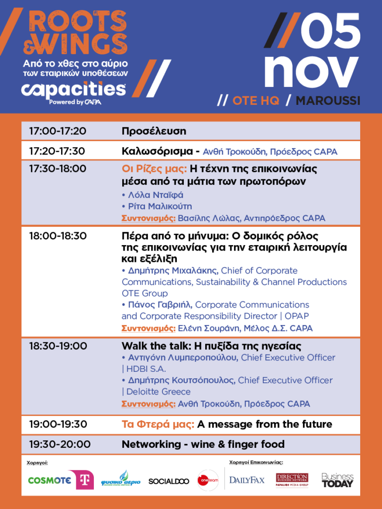 Με το βλέμμα στραμμένο στο μέλλον των Εταιρικών Υποθέσεων, η Ένωση Επαγγελματιών Εταιρικών Υποθέσεων (Corporate Affairs Professional Association – CAPA) διοργανώνει τη δεύτερη εκδήλωση της σειράς capacities powered by CAPA με τίτλο: “Roots & Wings – Από το χθες στο αύριο των εταιρικών υποθέσεων” την Τετάρτη 5 Νοεμβρίου 2025, στο Διοικητικό Μέγαρο του OTE στο Μαρούσι.