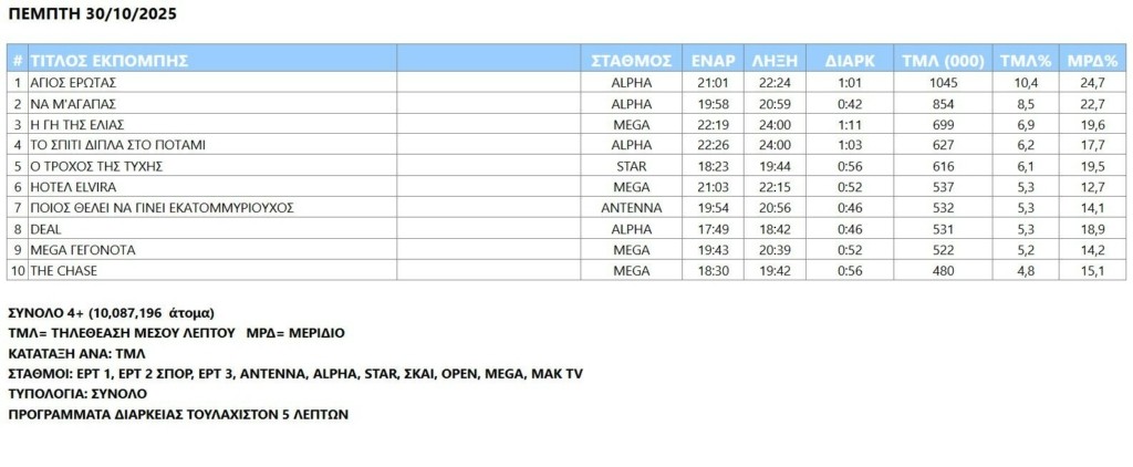 Πιο μεγάλο το κομμάτι τηλεθέασης του Alpha την Πέμπτη (30/10)