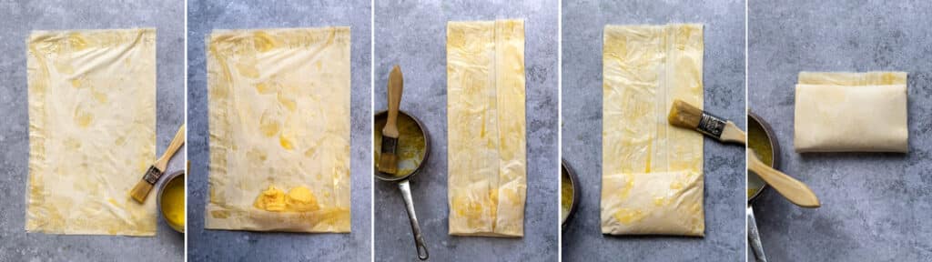 5. Βάλτε ένα φύλλο κρούστας στον πάγκο εργασίας και αλείψτε το με λιωμένο βούτυρο με ένα πινέλο ζαχαροπλαστικής. Τοποθετήστε άλλο ένα φύλλο από πάνω και βουρτσίστε το κι αυτό με λιωμένο βούτυρο. Διπλώστε το στη μέση έχοντας μπροστά σας τη στενή μεριά του φύλλου. Βάλτε στο κέντρο της άκρης που έχετε μπροστά σας 3 – 4 κουταλιές της σούπας από την κρέμα αφήνοντας περιθώριο δεξιά – αριστερά. Τυλίξτε λίγο την άκρη πάνω στην κρέμα, διπλώστε τα πλαϊνά του φύλλου πάνω στη γέμιση και ρολάρετε για να τυλίξετε σε ρολό. Βουρτσίστε το πακετάκι (ρολάκι) με λιωμένο βούτυρο και κρατήστε το στην άκρη. Κάντε την ίδια διαδικασία με το υπόλοιπο φύλλο ώστε να έχετε 6-8 πακετάκια.