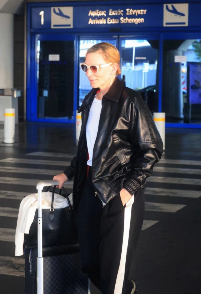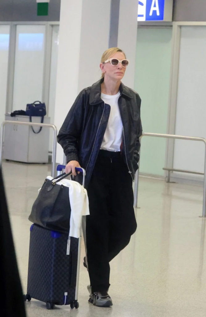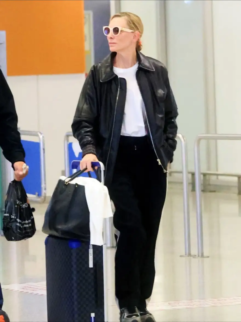 Στις σχετικές φωτογραφίες, η Κέιτ Μπλάνσετ φορά γυαλιά ηλίου, μαύρη φόρμα, λευκό t-shirt, δερμάτινο τζάκετ και sneakers, ενώ έχει τα μαλλιά της πιασμένα αλογοουρά.
