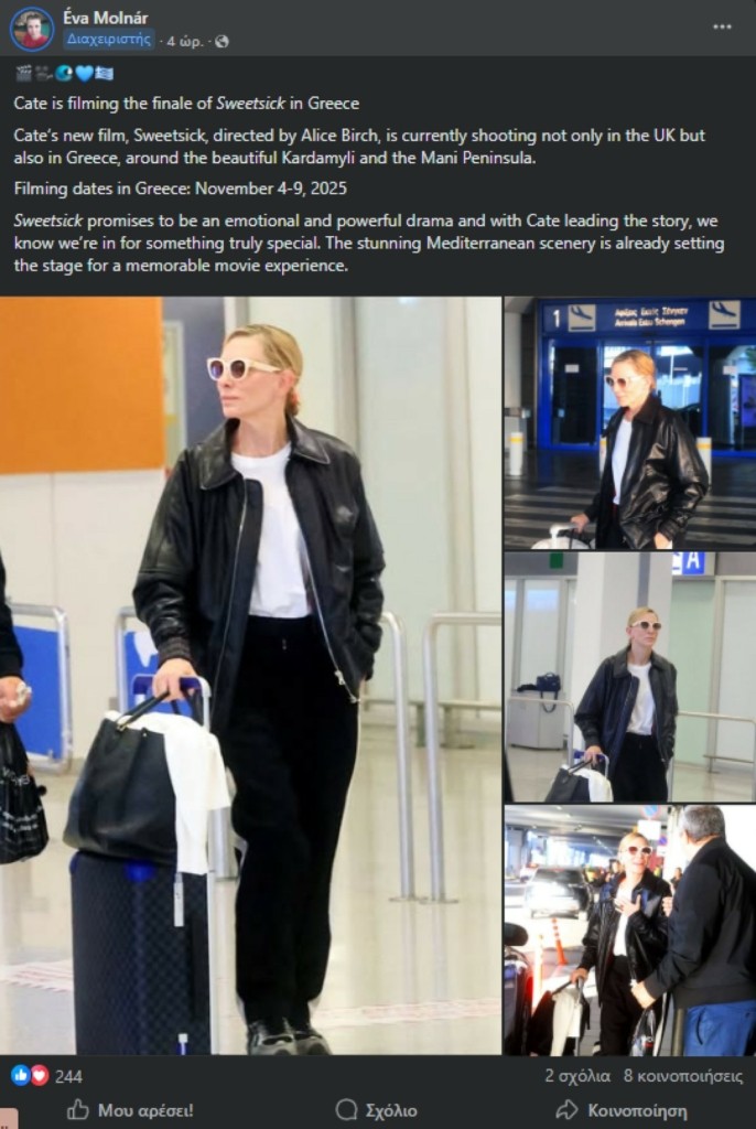 Στην Ελλάδα βρίσκεται εδώ και μερικές ώρες η Κέιτ Μπλάνσετ, για τις ανάγκες των γυρισμάτων της νέας της ταινίας, με τίτλο «Sweetsick».