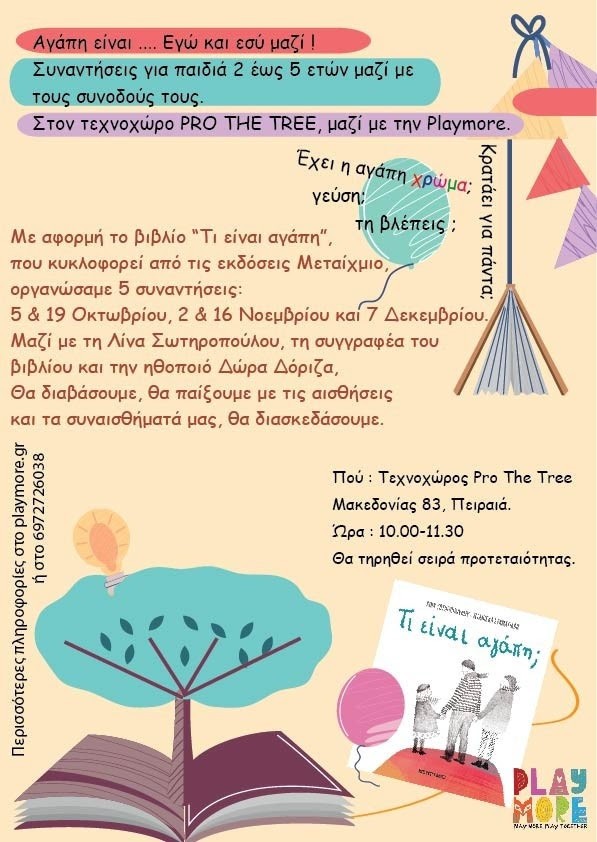 Με αφορμή το βιβλίο «ΤΙ ΕΙΝΑΙ ΑΓΑΠΗ» που κυκλοφορεί από τις εκδόσεις Μεταίχμιο, η συγγραφέας Λίνα Σωτηροπούλου και η ηθοποιός-συγγραφέας Δώρα Δόριζα δημιούργησαν ένα ειδικά διαμορφωμένο πρόγραμμα για παιδιά ηλικίας 2 έως 5 ετών και τους συνοδούς τους.