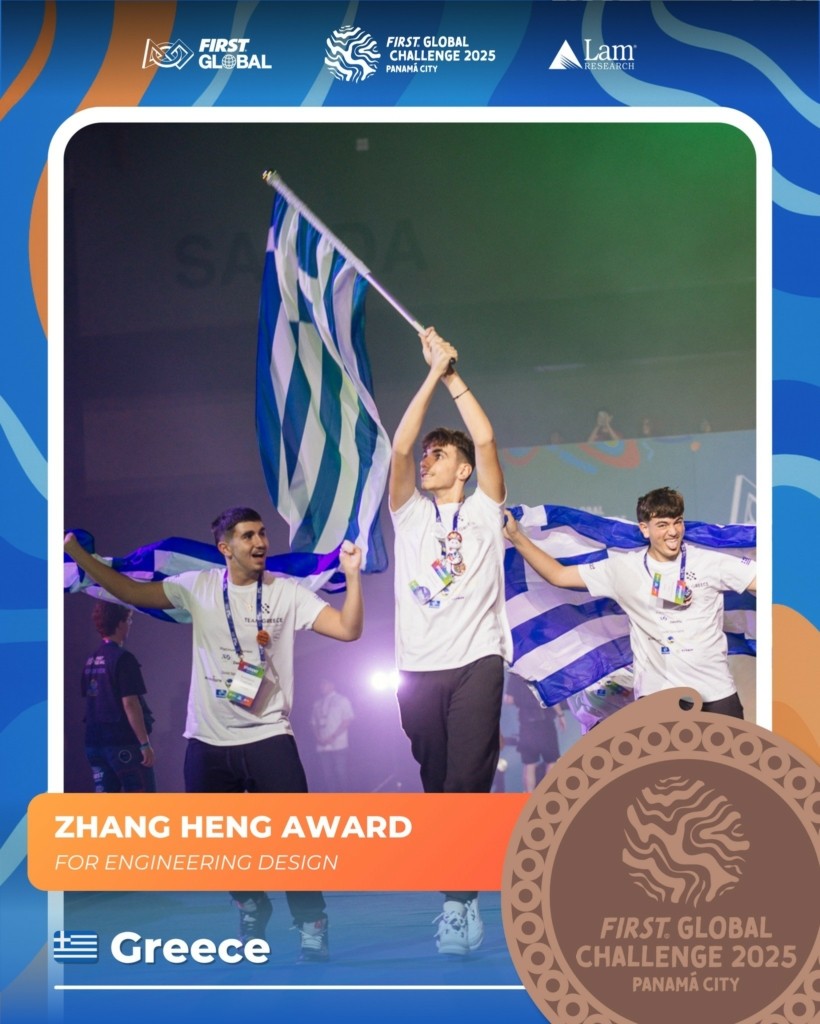Το χάλκινο μετάλλιο «Zhang Heng Award for Engineering Design» κατέκτησε η Εθνική Ομάδα Ρομποτικής «FIRST Global Challenge Team Greece powered by ΔΕΗ», που διαγωνίστηκε στην Ολυμπιάδα Ρομποτικής FIRST Global Challenge, η οποία πραγματοποιήθηκε το διάστημα 29 Οκτωβρίου έως 1 Νοεμβρίου 2025 στον Παναμά.