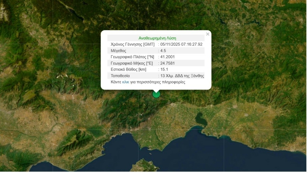«Εκ μέρους των τεσσάρων φορέων συγκρότησης του Ενιαίου Εθνικού Σεισμολογικού Δικτύου, το Γεωδυναμικό Ινστιτούτο του Εθνικού Αστεροσκοπείου Αθηνών ανακοινώνει ότι σήμερα, στις 09:16 ώρα Ελλάδος, το σεισμολογικό δίκτυο κατέγραψε ασθενή σεισμική δόνηση με μέγεθος 4.5 στην κλίμακα Richter. Ο σεισμός έγινε σε απόσταση 370 χλμ. ΒΒΑ των Αθηνών. Το επίκεντρο της δόνησης εντοπίζεται 13 χλμ. ΔΒΔ της Ξάνθης και εστιακο βάθος 15,1 χλμ.», αναφέρεται στην επίσημη ανακοίνωση.