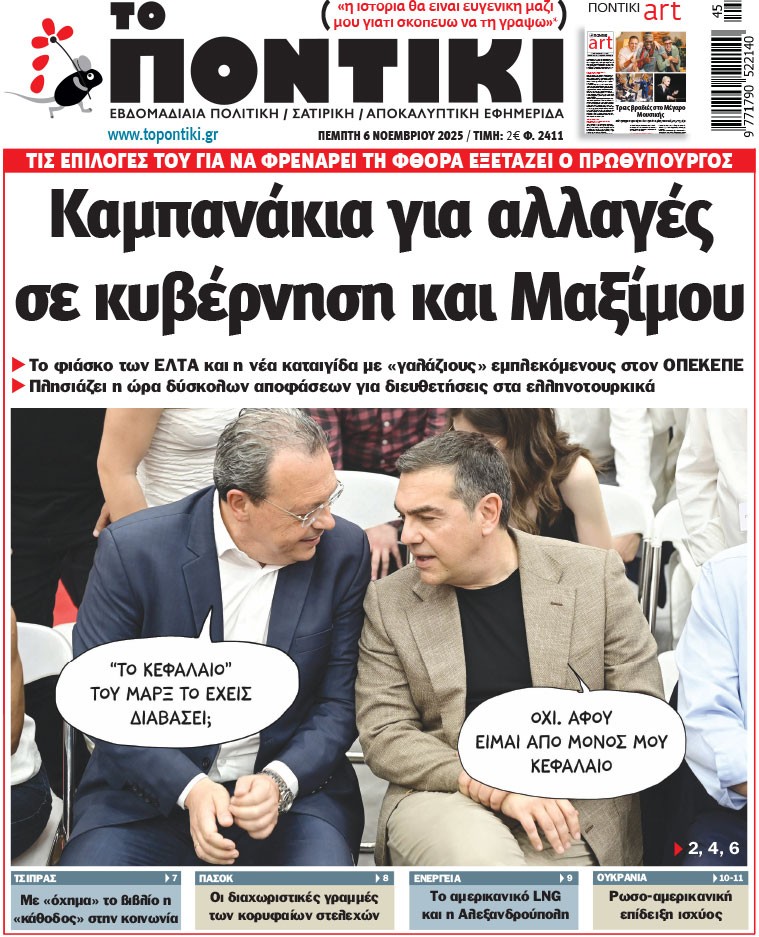 Με πρωτοσέλιδο τίτλο «Καμπανάκια για αλλαγές σε κυβέρνηση και Μαξίμου» και αναλυτικό – αποκαλυπτικό ρεπορτάζ για το φιάσκο των ΕΛΤΑ και τη νέα καταιγίδα με «γαλάζιους» εμπλεκόμενους στον ΟΠΕΚΕΠΕ, αλλά και για το ότι πλησιάζει η ώρα των δύσκολων αποφάσεων για διευθετήσεις στα ελληνοτουρκικά, κυκλοφορεί το «ΠΟΝΤΙΚΙ» το πρωί της Πέμπτης.