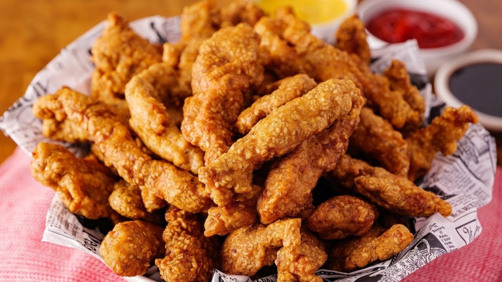 5. Σε ένα τηγάνι, ζεστάνετε το σπορέλαιο σε μέτρια φωτιά. Μόλις είναι έτοιμο το λάδι μεταφέρετε προσεκτικά μια- μια τις λωρίδες κοτόπουλου (σε δόσεις), με μια λαβίδα, μέσα στο τηγάνι. Τηγανίστε για 2-3 λεπτά από κάθε πλευρά, μέχρι να ροδίσουν ελαφρά, χωρίς να το παρακάνετε, για να μην στεγνώσει το κρέας.