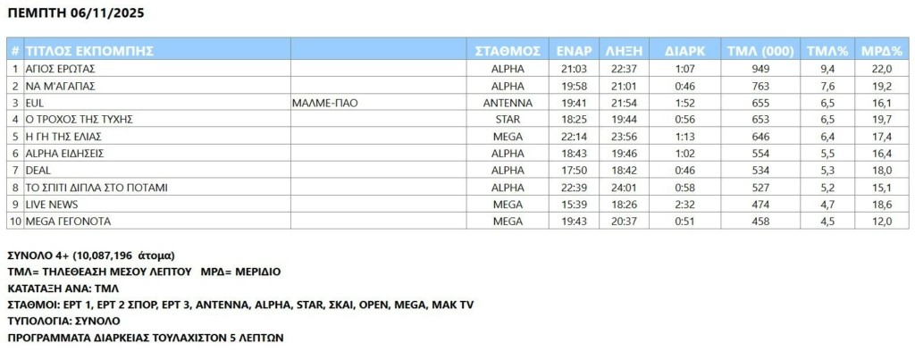 Νταμπλ στην κορυφή της τηλεθέασης ο Alpha με την επίδοση της Πέμπτης (6/11)