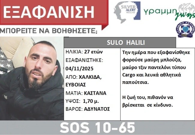 Συναγερμός έχει σημάνει στις αρχές, μετά την εξαφάνιση ενός 27χρονου άνδρα από τη Χαλκίδα από την Τρίτη 4 Νοεμβρίου.