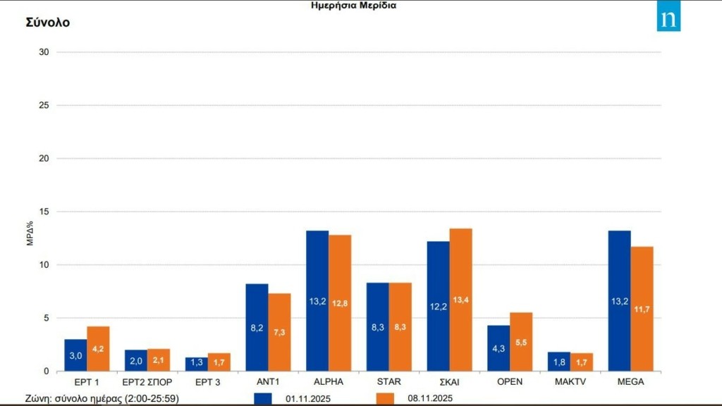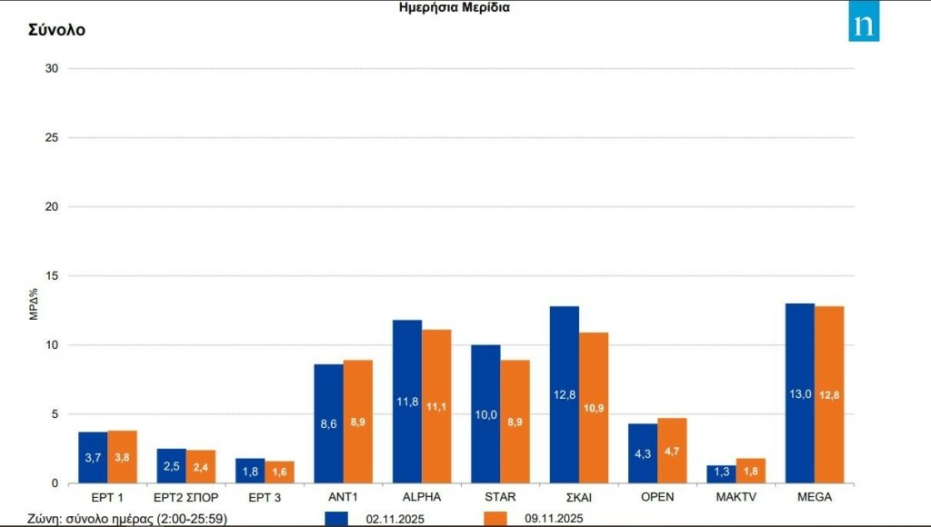 Την Κυριακή δεύτερος στις τηλεπροτιμήσεις ήταν ο Alpha, παρά την κάμψη στην συνολική τηλεθέαση του. Μεγαλύτερη ήταν (-2,5%) η μεταβολή στη δυναμική του ΣΚΑΪ ο οποίος ναι μεν διατηρήθηκε στην περιοχή με τα διψήφια μερίδια, πέρασε όμως τρίτη θέση.