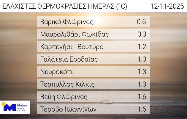 Το πρωί, σύμφωνα με το meteo, το θερμόμετρο στο Βαρικό Φλώρινας έγραψε την χαμηλότερη θερμοκρασία με -0,6 °C.