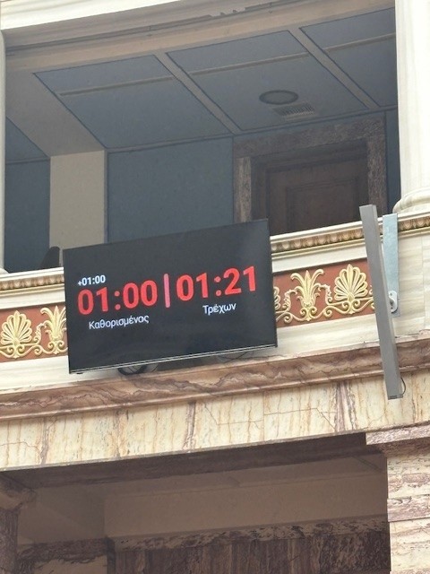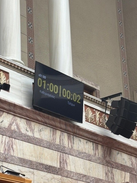 Οι μεγάλες οθόνες στην αίθουσα της ολομέλειας -2 πάνω από το προεδρείο που βλέπουν οι βουλευτές από τα έδρανά τους και μια απέναντι από τον ομιλητή για να βλέπει ο ίδιος τον χρόνο- θα αλλάζουν χρώματα. Με την έναρξη της ομιλίας τα γράμματα θα είναι λευκά ενώ θα αναγράφεται και ο επιπλέον χρόνος 25% που δίνεται. Ένα λεπτό πριν τη λήξη του προβλεπόμενου χρόνου θα ακούγεται ένας ήχος και τα γράμματα θα γίνονται κίτρινα. Με την εξάντληση του οριζόμενου χρόνου το χρώμα θα γίνεται κόκκινο και θα παραμένει και για τα επιπλέον λεπτά (25%). Αμέσως μετά το μικρόφωνο θα κλείνει και η κάμερα θα γυρίζει στα έδρανα.
