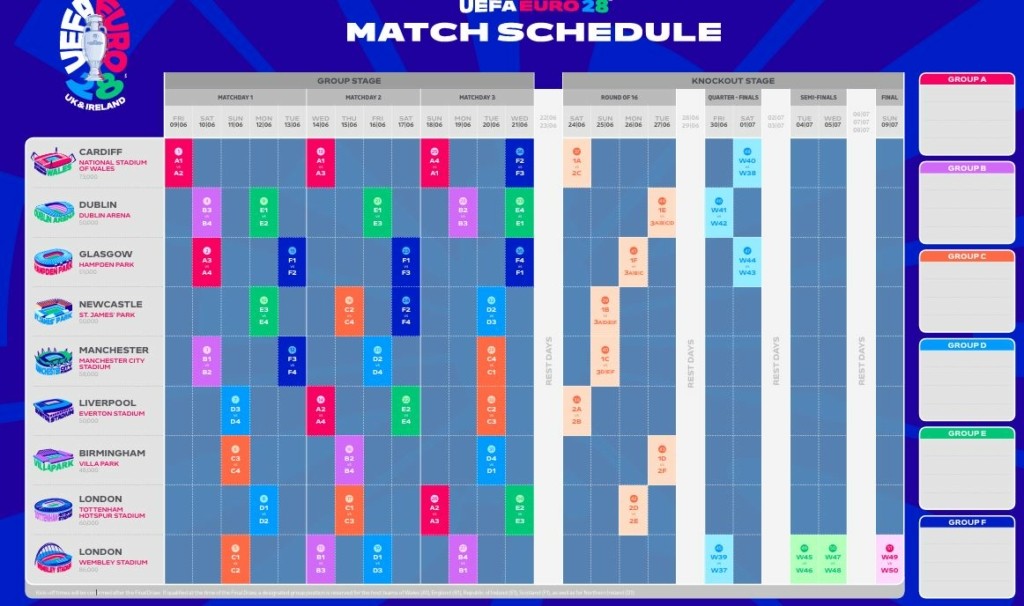 Το Κάρντιφ θα φιλοξενήσει τον εναρκτήριο αγώνα του Euro 2028 στις 9 Ιουνίου, ενώ ο τελικός θα διεξαχθεί στο Γουέμπλεϊ του Λονδίνου στις 9 Ιουλίου.