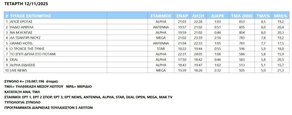 Υψηλές τηλεθεάσεις για τρεις σταθμούς την Τετάρτη (12/11)- Πρώτος σε προτιμήσεις παρέμεινε ο Alpha