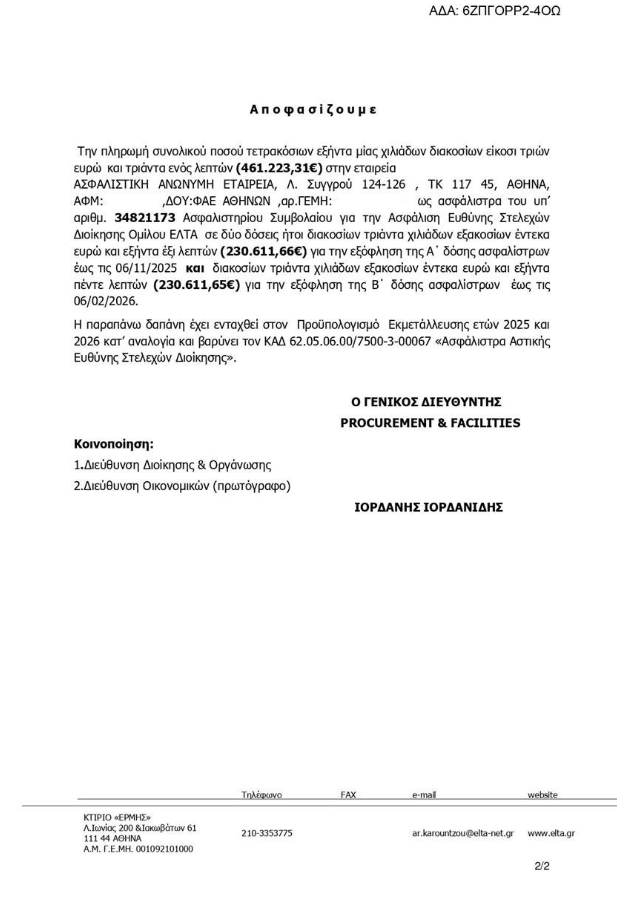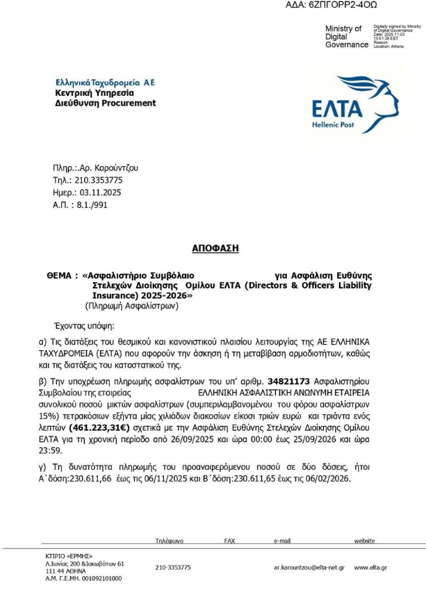 Το ασφαλιστήριο καλύπτει τις τελευταίες 40 κρίσιμες ημέρες με τον Σκλήκα στην ηγεσία του οργανισμό και χρεώνεται στον προϋπολογισμό των ΕΛΤΑ για το 2025-2026.