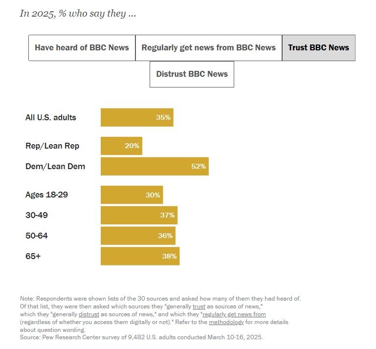 Στο ερώτημα πόσο εμπιστεύονται το BBC News οι Αμερικανοί απάντησαν καταφατικά σε ποσοστό 35%, πέφτει στο 20% στους Ρεπουμπλικάνους και ανεβαίνει στο 52% στους Δημοκρατικούς.