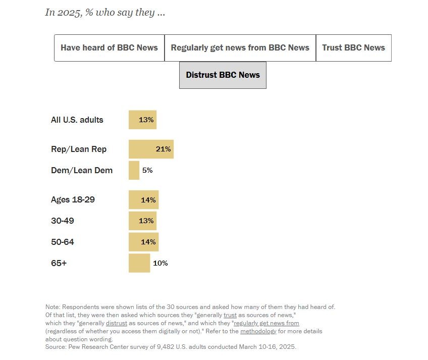 Μόλις ένας στους δέκα (13%) δεν εμπιστεύεται την ενημέρωση από το ειδησεογραφικό κανάλι του BBC και γίνονται δύο στους δέκα (21%) στις τάξεις των Ρεπουμπλικάνων. Αντιθέτως μόλις 5% των Δημοκρατικών ψηφοφόρων εμφανίζεται να μην το εμπιστεύεται.