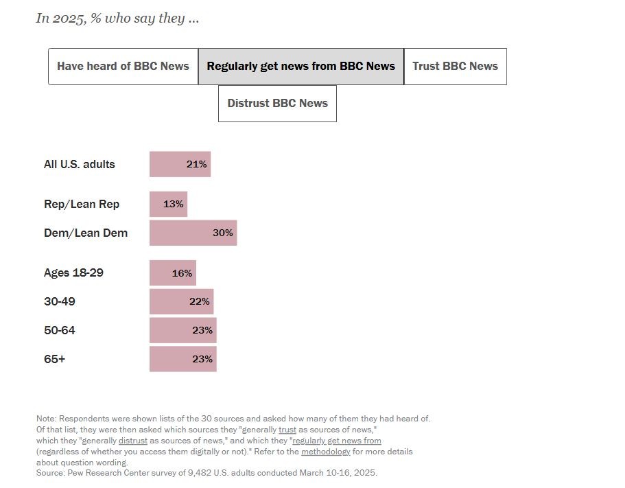Το Κέντρο Κοινωνικών Ερευνών Pew έψαξε να δει «τι παίζει» με το BBC και την αμερικανική κοινή γνώμη, αν το παρακολουθούν, ενημερώνονται και το εμπιστεύονται.