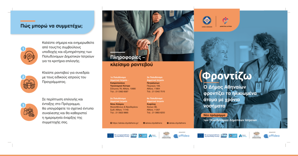 Παρατείνεται το καινοτόμο πρόγραμμα «ΦΡΟΝΤΙΖΩ» του Δήμου Αθηναίων έως το τέλος Δεκέμβριου του 2025. Άτομα της τρίτης ηλικίας που πάσχουν από χρόνια νοσήματα, όπως υπέρταση, διαβήτη, καρδιολογικά, πνευμονολογικά, ρευματικά και άλλα προβλήματα υγείας, έχουν τη δυνατότητα να λάβουν δωρεάν υπηρεσίες φροντίδας και υποστήριξης μέσω των Πολυδύναμων Δημοτικών Ιατρείων της πόλης.