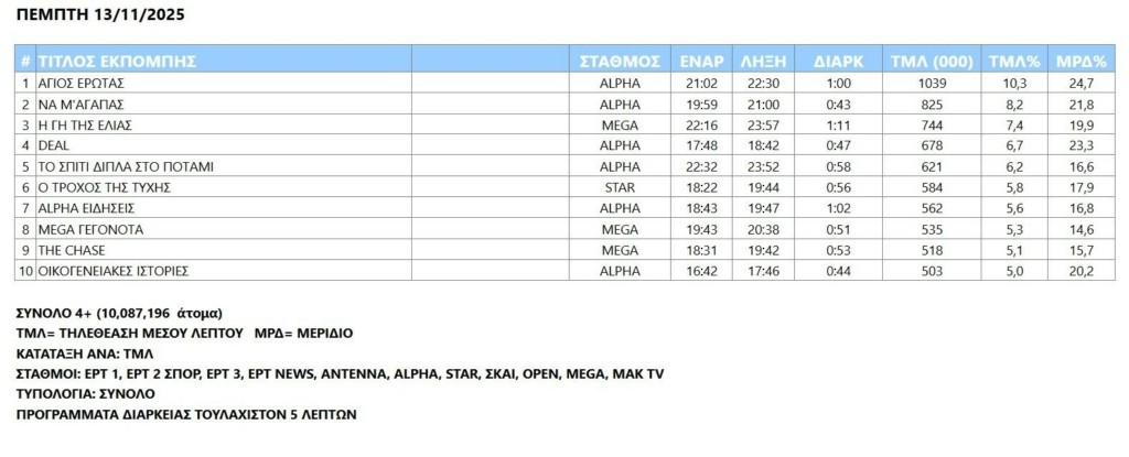 Τρίτη επιλογή με επίδοση σταθερά τις τελευταίες ημέρες άνω του 7%, η «Γη της ελιάς», με το «Deal» στο νούμερο 4 της κορυφαίας 10άδας προγραμμάτων.