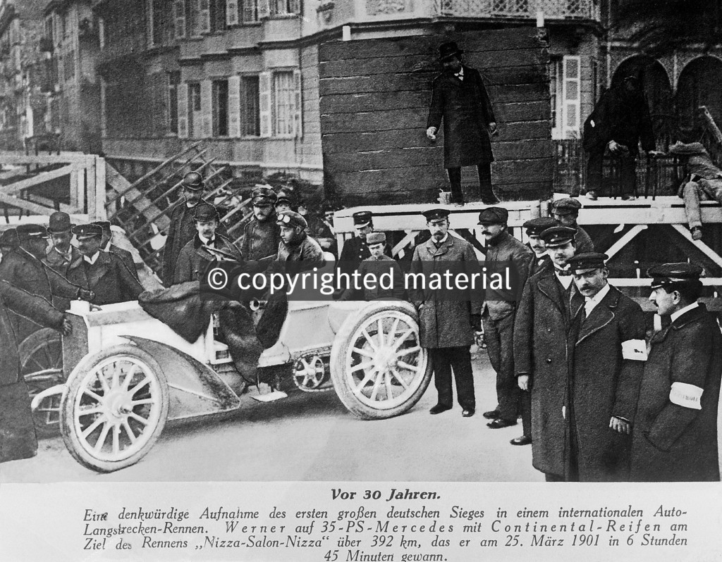 Μετά από αυτή τη φάση τελειοποίησης το πρώτο Mercedes στην ιστορία αποστέλλεται στον Emil Jellinek στη Νίκαια στις 22 Δεκεμβρίου 1900. Ο επιχειρηματικός εταίρος της DMG συμμετέχει με αυτό το νέο είδος αυτοκινήτου στην Εβδομάδα Αγώνων της Νίκαιας, που πραγματοποιείται από τις 25 έως τις 29 Μαρτίου 1901 με εντυπωσιακή επιτυχία. Το Mercedes 35 hp κυριαρχεί στους αγώνες, κατακτώντας τη νίκη στη διαδρομή Νίκαια-Salon-Νίκαια, μήκους 392 χιλιομέτρων, καθώς και στην ανάβαση της La Turbie.